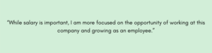 You should also consider these benefits when weighing options for other job offers. Think about other factors such as company culture, benefits, job flexibility, opportunities for growth, etc. While one job may pay more, it may not have a great company culture. You want to consider all factors when thinking about your desired salary at any company. For example, you may be okay with a lesser salary at a company that you believe is a better fit or that has better benefits.