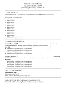 Your skills section will focus on the intersection of your transferable skills and the skills listed on the job description. A few examples of transferable skills include managing budgets, leadership, effective communication, training and mentoring, data analysis, negotiating contracts, and time-management. It’s important to read through the entire job description and understand what candidates they are seeking in order to have a resume that clearly speaks into how you fit into the role.
