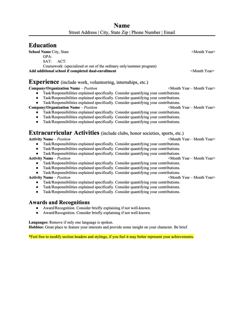 High school résumés give colleges a snapshot of your work experience, extracurricular involvement, awards, and achievements. Résumés can also be helpful in preparing for interviews or to give to teachers and counselors who are writing your recommendation letters.
