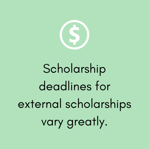 Since some schools require you to submit a separate scholarship application upon submitting your general application, be sure to check the websites of the colleges you are applying to or have been admitted to and determine whether there are specific scholarships for which you can apply. As with external scholarships, institutional scholarship deadlines will vary. It is best to check institutional scholarship availability at the start of your college application process.