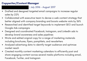 When drafting each experience list the name of the company first, then your title. If your title better correlates to the title(s) of the positions you’re applying to, you should include the title first. This section of your resume should be written in bullet point format and exclude the use of pronouns (e.g. I, you, he, she). Each bullet point within this section should begin with an action verb that illustrates your responsibilities and achievements. Try to provide as much contextual information as possible to help hiring managers understand the scope of the work you did. You should use industry-specific vocabulary to demonstrate your experience. Also, quantify your experience and contributions wherever possible. You can do this by describing the number of customers you assisted, providing the number of employees you managed, or dollar amount you contributed to sales for the companies you’ve worked at.
